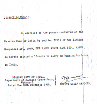 This certifies that the Reserve Bank of India has recognised The Karur Vysya Bank Ltd., as a distinct financial entity with the ability to carry on banking activities in India.
